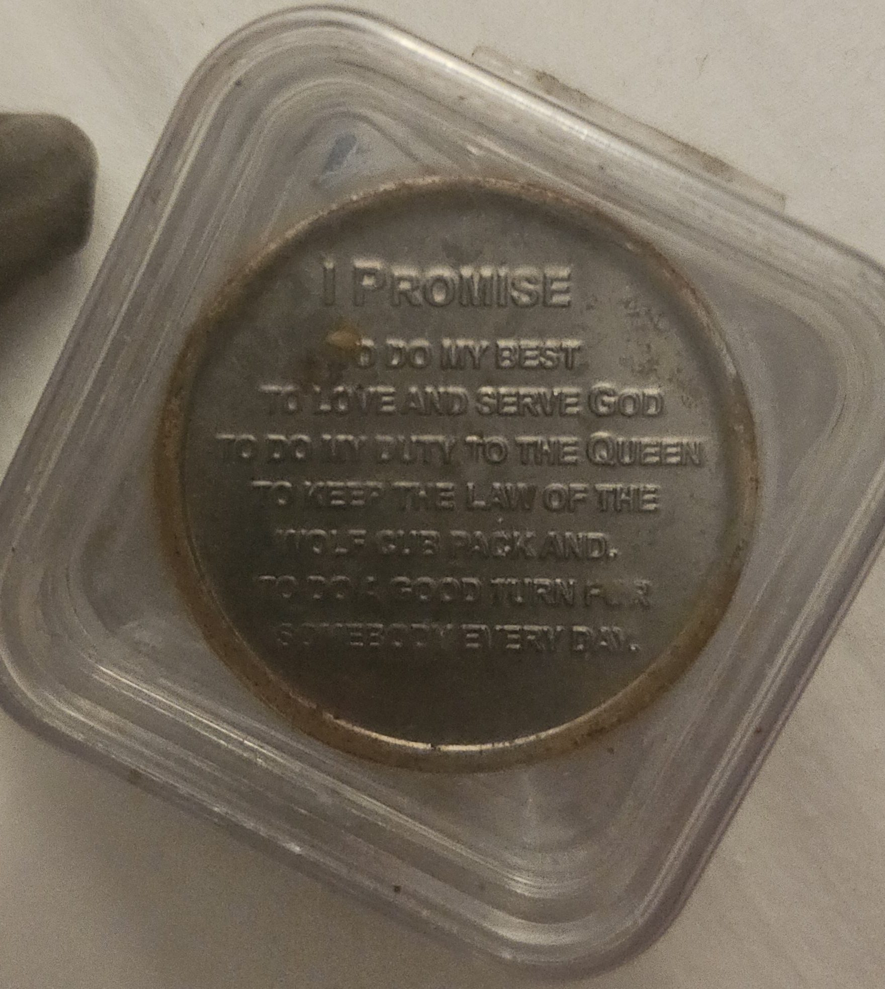 I said that I have the coin he described at home. The class laughed but I was not joking. I got it at the provincial jamboree in scouting at the leaders camp when the scouts who had achieved their chef cub scouts awarded were being taken to sign a book and be given honors.
